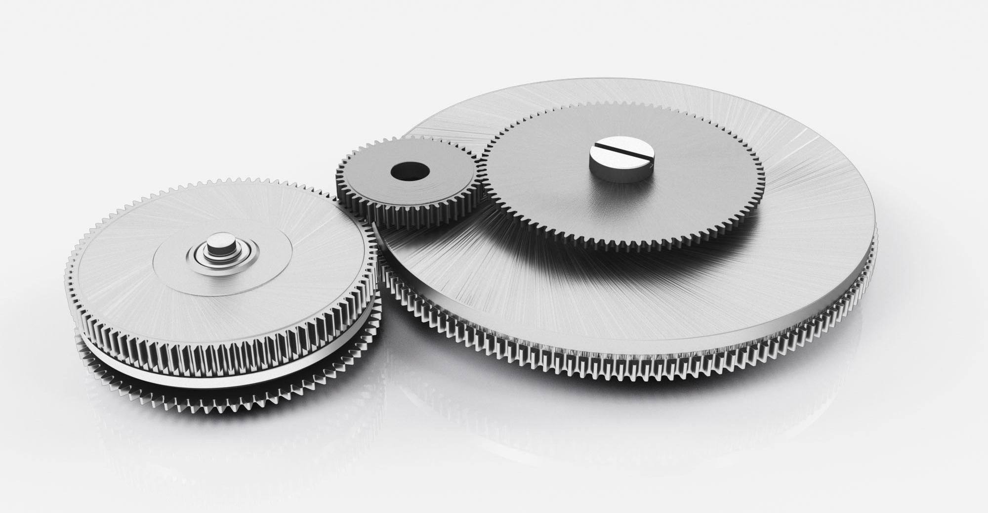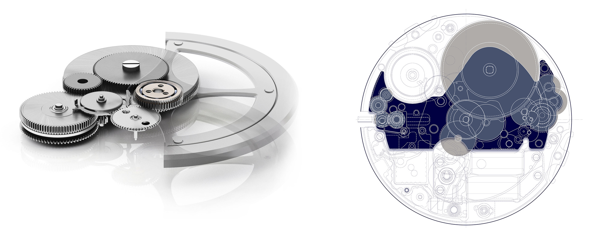 To ensure robustness, a crucial consideration when making any movement thinner, the gear train was tweaked to fit along the central horizontal axis of the movement and locked under a one-piece center bridge. The choice of a one-piece bridge was to better stabilize the wheels in case of shock.