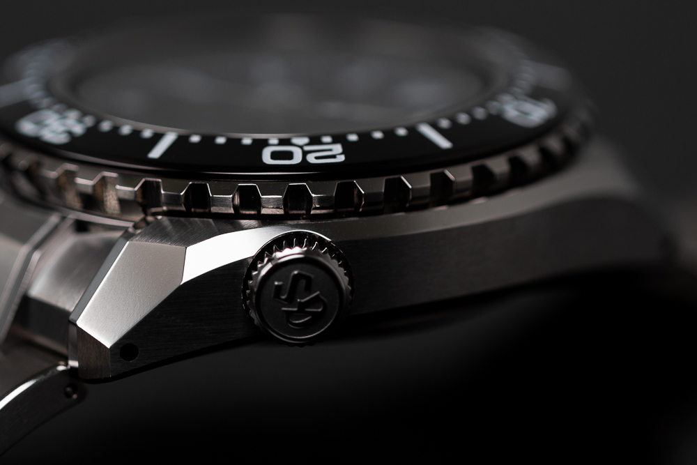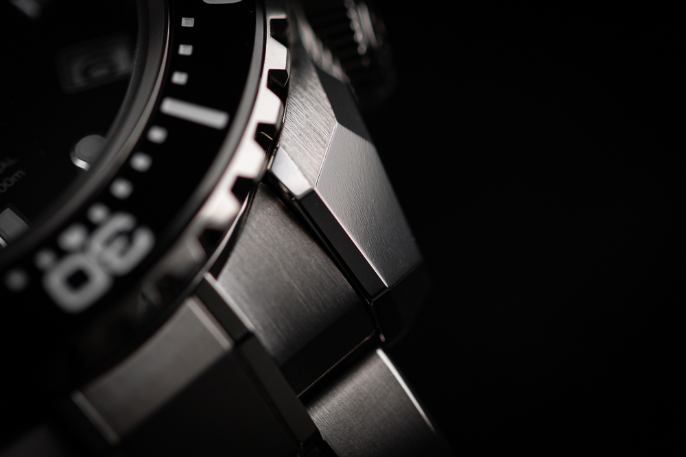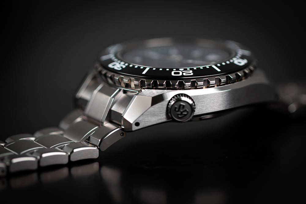 The case is finished with an eye-catching blend of hairline and Zaratsu-polished surfaces, a mix that emphasizes the dramatic, angular case geometry (note the complex faceting along the lugs and case sides). Though it’s spec’d like a professional diving instrument, it’s finished like a true luxury timepiece. The bezel insert is steel and features a black hard coating to ensure that it doesn’t fracture or break. Protecting the dial is a “high-definition” sapphire crystal that is also quite thick, a requirement for deep dives. All of these case elements are designed for easy disassembly and maintenance.
