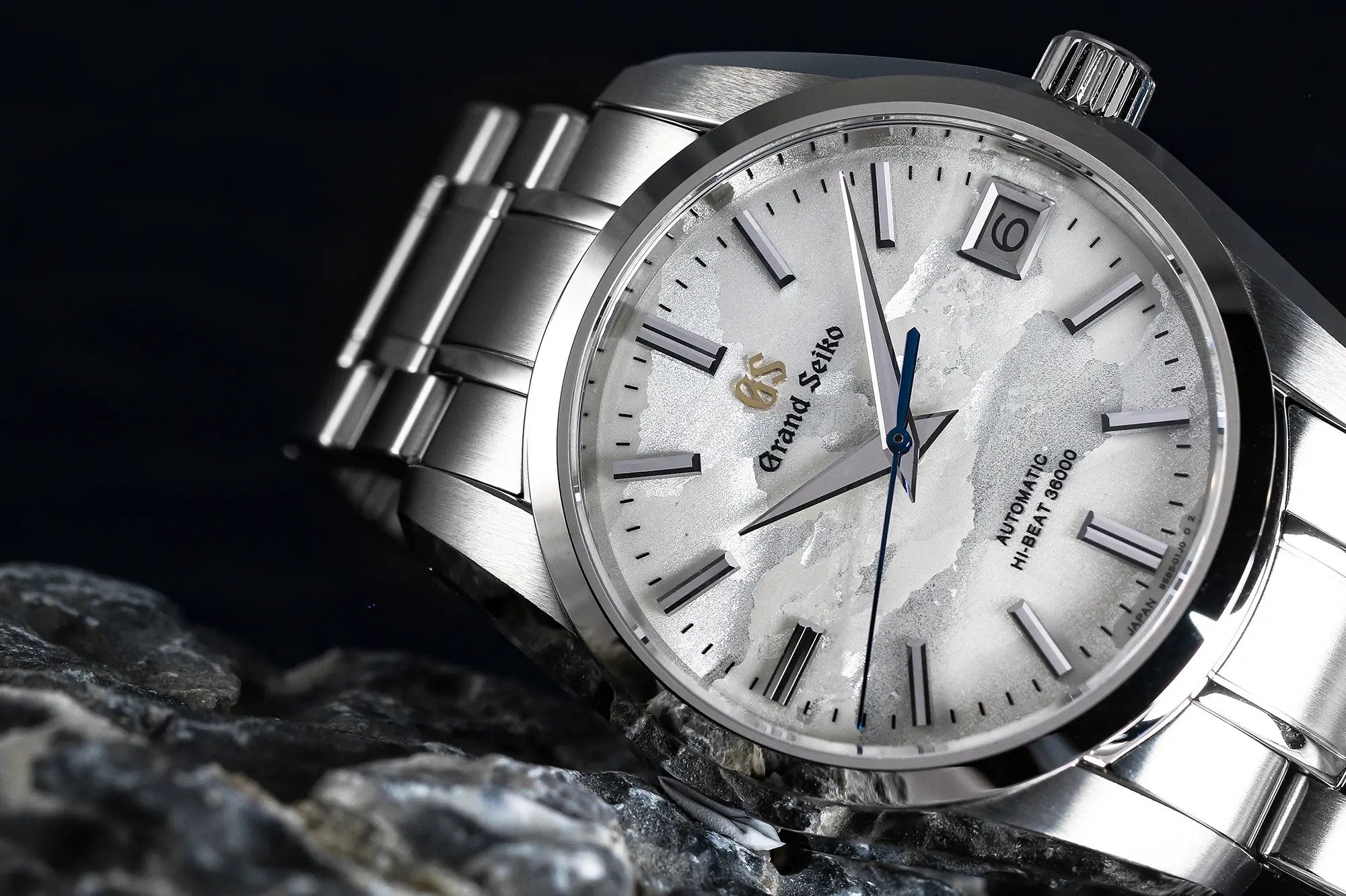 SBGH311 is the first of these two celebratory timepieces. With its distinct texture and silver color, the dial of SBGH311 evokes the sea of clouds that cover Mt. Iwate at daybreak. This phenomenon occurs when the air is so still and humid that dense clouds overlap and create a mesmerizing silvery-white sea. Electroforming was used to create this entirely new dial pattern, giving it a uniquely mottled effect never before seen from Grand Seiko. The diamond-cut hour and minute hands, tempered blue seconds hand, and indexes offer beauty and legibility, a key tenet of Grand Seiko’s design language. A gold color Grand Seiko logo offers a splash of warmth against the cooler backdrop.