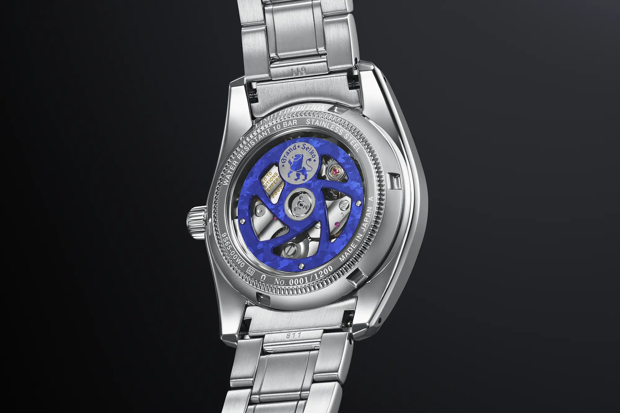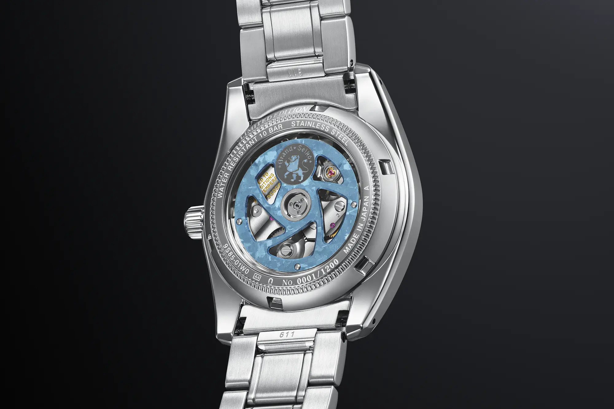 SBGH311 is the first global release to bring together a Hi-Beat movement and the original 37mm case. Visible through the sapphire crystal case back is the Hi-Beat 36000 automatic mechanical Caliber 9S85. This excellent movement is hand-assembled by the skilled craftsmen and women of Grand Seiko Studio Shizukuishi. It features an accuracy rating of +5 / -3 seconds per day with a 55-hour power reserve. Additionally, the oscillating weight has undergone an anodic oxidation treatment, giving it a distinct and vibrant blue hue that suggests the deep-blue sky above the sea of clouds. A Grand Seiko emblem is inset into the oscillating weight.