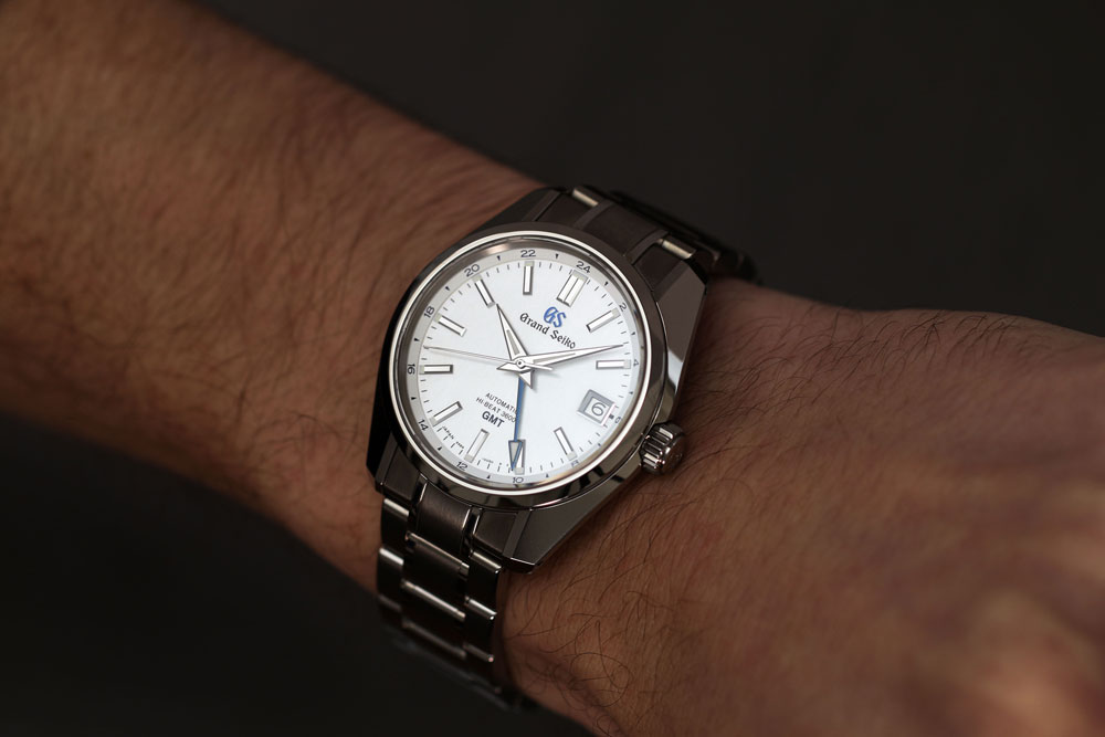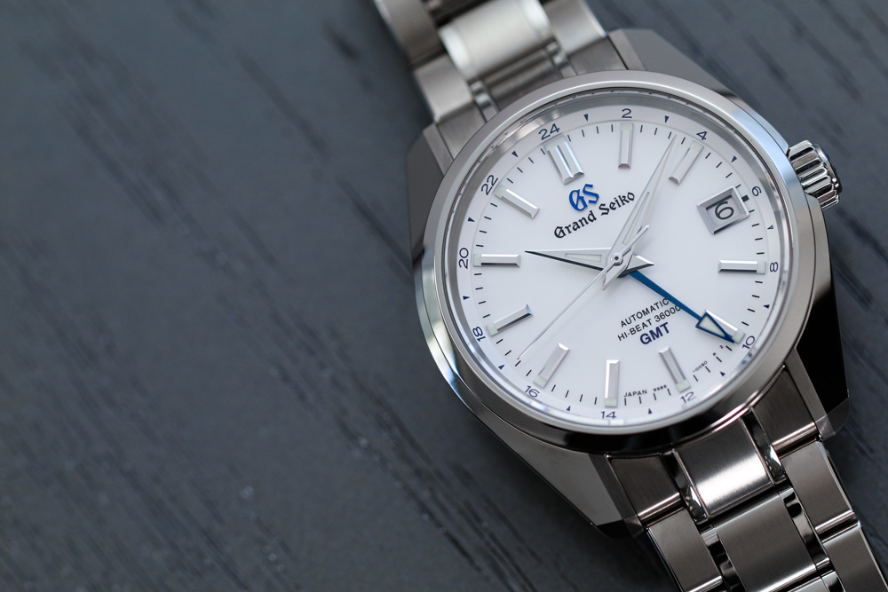 The white dial of SBGJ255 is markedly vibrant, with a vertical texture creating a subtle dimensionality that catches the eye. Blue accents on the “GS” logo, “GMT” text, GMT hand, and the 24-hour index offer a pop of color. One notable point of distinction on the dial is the use of luminous pant (LumiBrite) across the hands and indexes. This is a feature generally relegated to the Sport Collection and this is the first 44GS model to come with luminous paint on the dial. Its inclusion here ensures nighttime legibility regardless of lighting conditions.