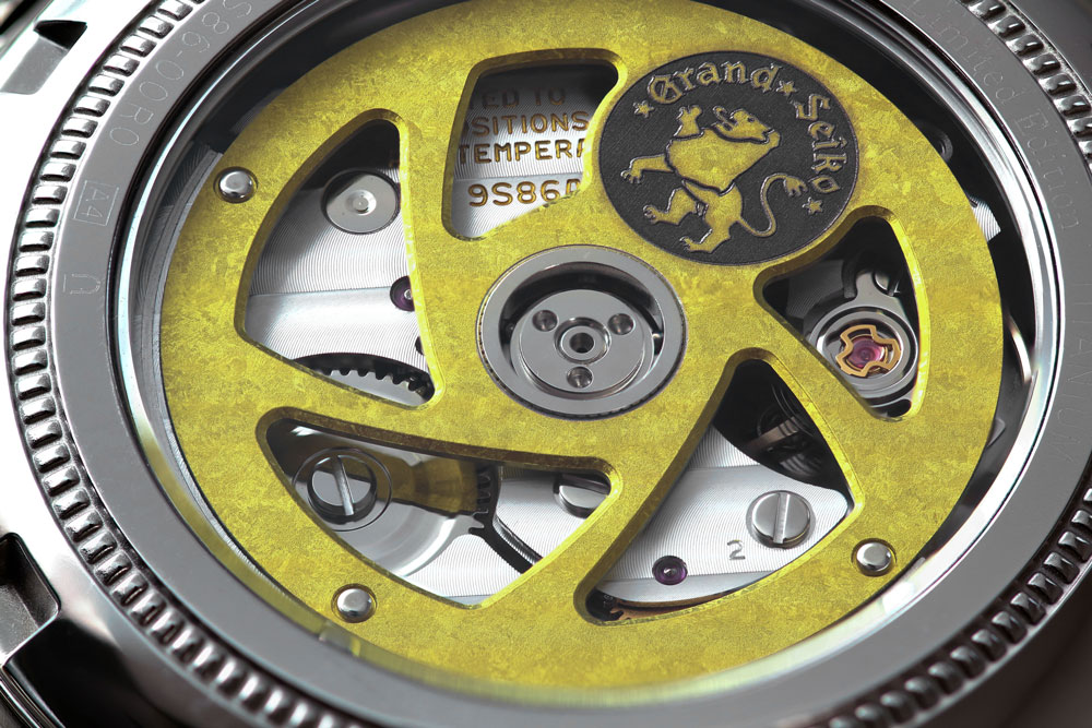The movement’s oscillating weight features the Grand Seiko lion emblem, and it is finished in a gold tone that is achieved through an anodic oxidation process. This is when the titanium is subjected to electrolysis, which generates an oxide film. The color itself is determined according to the light refraction index, and it can be changed by adjusting the thickness of the oxide film.