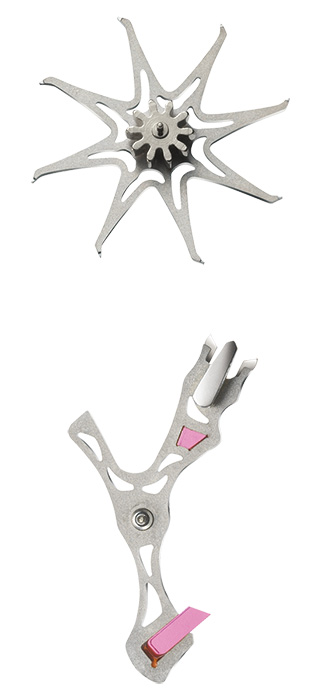 By using only two pallet stones on the pallet fork, one pallet roller and impulse jewel, a single escape wheel with only 8 teeth, and having each of these items fabricated through MEMS technology for ultra-high precision, the escapement is incredibly lightweight, which helps to stabilize its performance and increases duration of the power reserve. Of course, this unique design has patents applied to it.